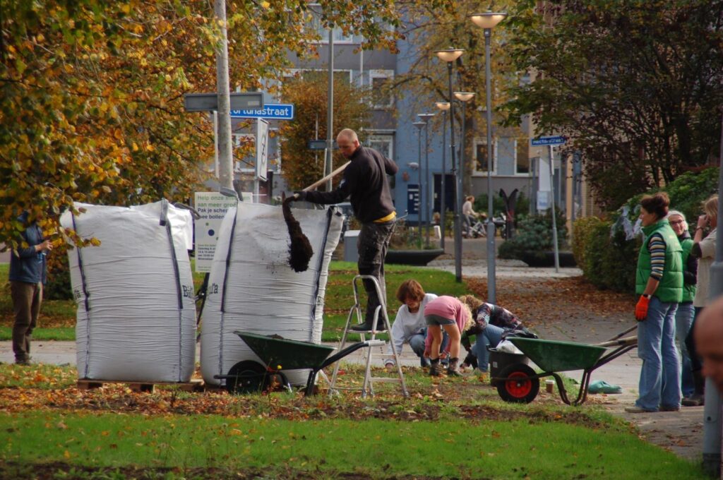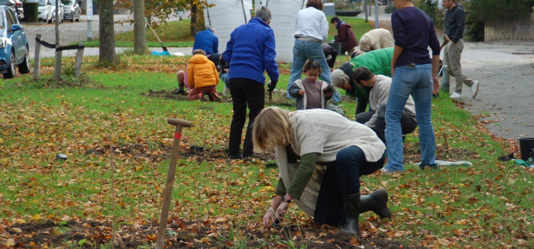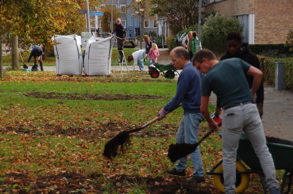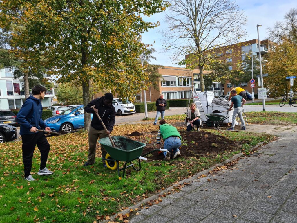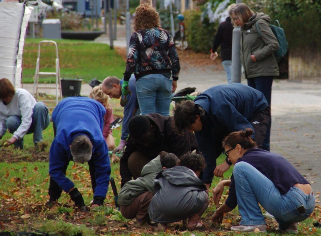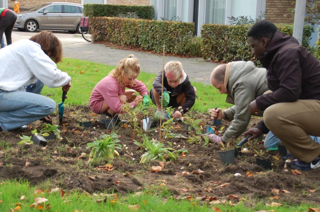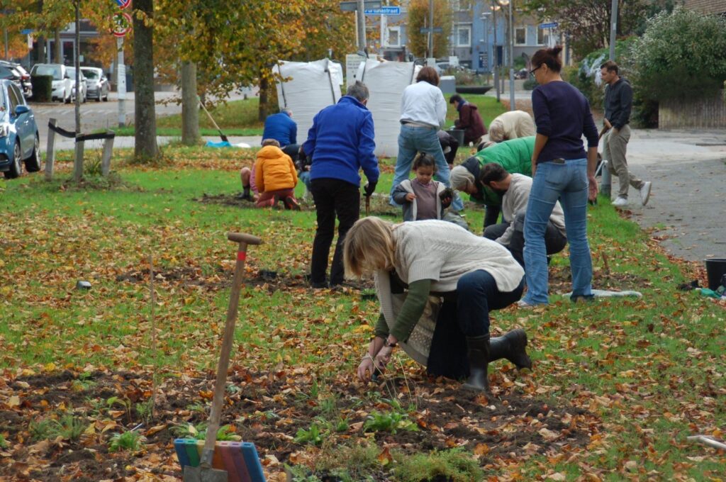 Het resultaat werd afgelopen weekend zichtbaar toen we samen met buurtbewoners ruim 6.000 bollen en planten de grond in zetten. In twee dagen tijd veranderden kale grasstroken in bloeiende “Bed & Breakfasts voor insecten” — goed voor wilde bijen, vlinders, kleine zoogdieren (zoals egels) en vogels.